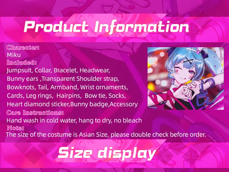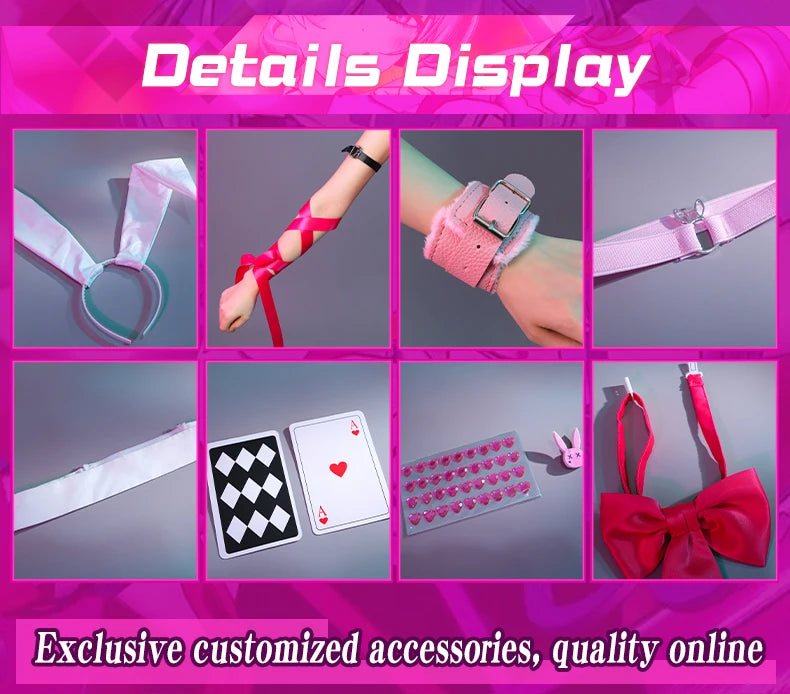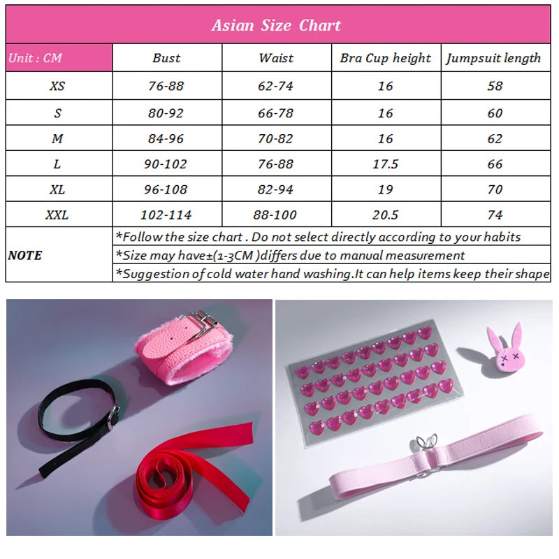Includes: Jumpsuit,collar,bracelet,headwear,bunny ears,transparent shoulder strap,bowknots,tail,armband,wrist ornaments,cards,leg rings, hairpins, bow tie,socks,heart diamond sticker,bunny badge,accessory